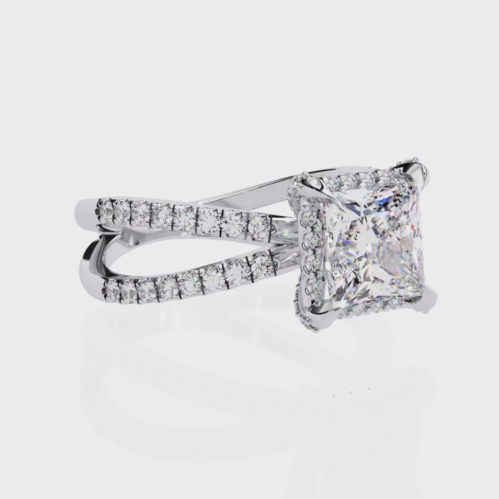 The sharp, geometric lines of the Princess cut contrast beautifully with the softness of the halo and the intricate pavé detail of the crossover band. This high-impact design delivers continuous sparkle and maximum glamour, symbolizing a love that is intertwined and destined for brilliance.
