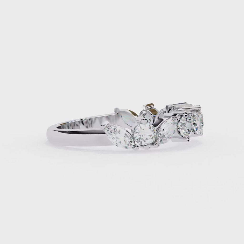 The thoughtful design of this half eternity band allows for both comfort and a captivating visual appeal. The alternating cuts provide a unique contrast in brilliance, with the elongated marquise stones creating an illusion of length and the round diamonds adding classic fire. Perfect as a wedding band, an anniversary gift, or a fashionable stacking ring, it's a piece that truly stands out.