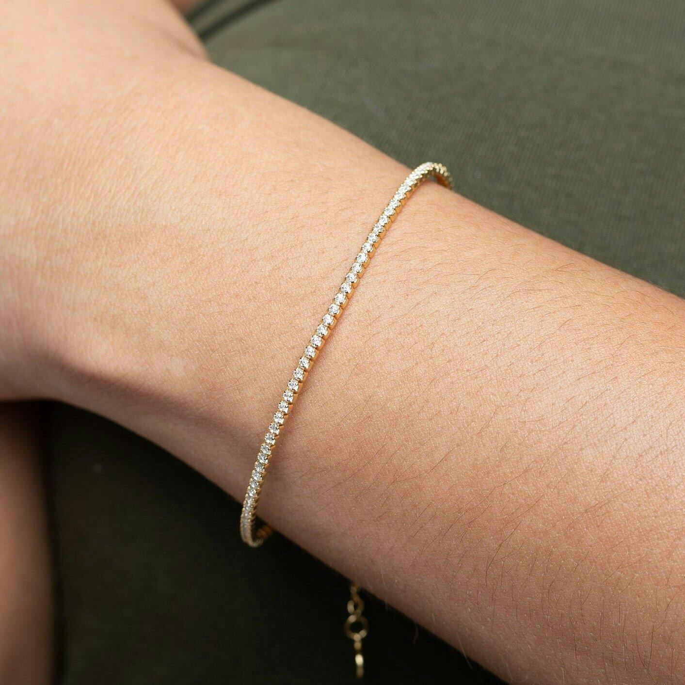 Refined and contemporary, the Elegant Gold Baguette Diamond Tennis Bracelet is a sleek expression of modern luxury. Featuring a seamless line of expertly cut baguette diamonds, this bracelet offers clean lines and a captivating geometric brilliance. Each diamond is precisely set in polished gold, creating a fluid, sophisticated silhouette that sparkles with understated elegance.