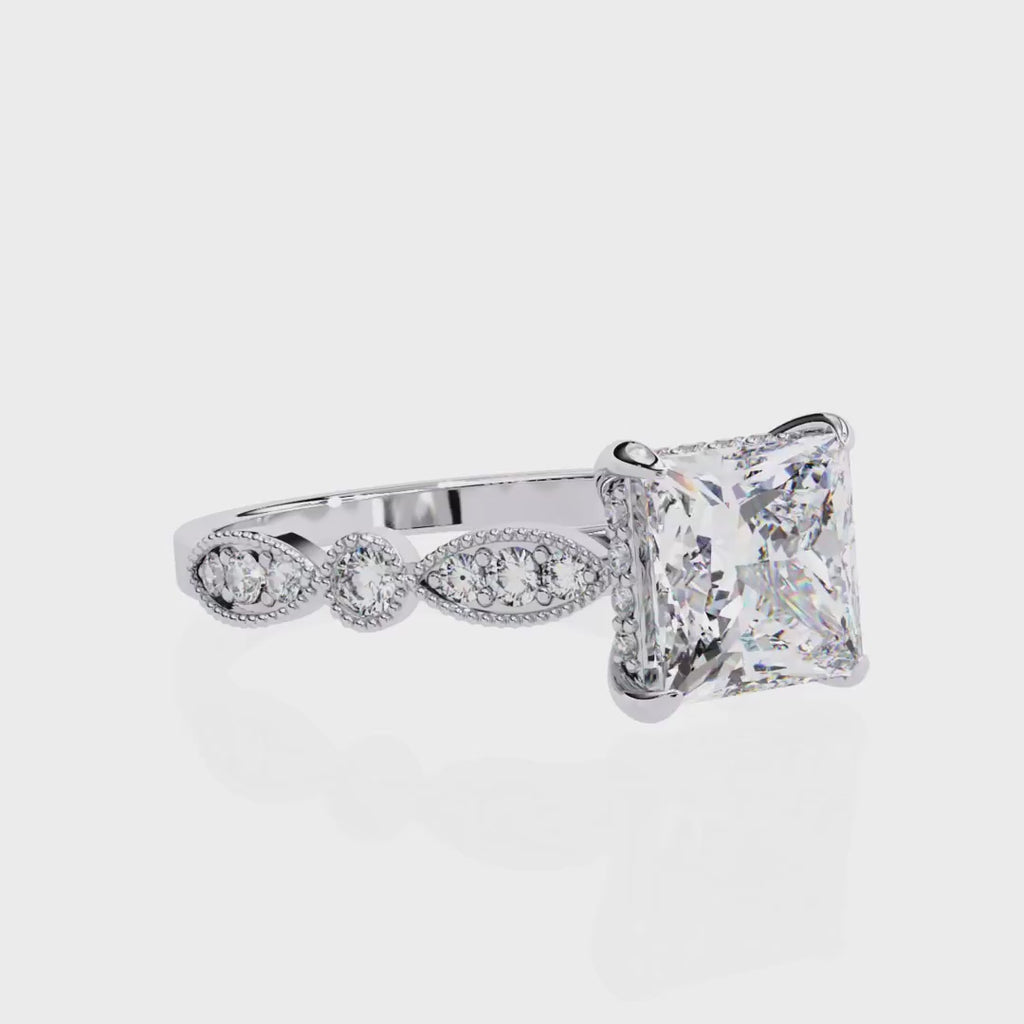 This ring masterfully combines the geometric brilliance of the Princess cut with the timeless charm of antique design, creating a unique and luxurious piece. It is the perfect choice for an engagement or a milestone anniversary, offering a magnificent presence and an heirloom quality that will be cherished forever.